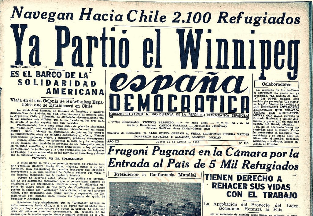 Guiado por el poeta de las odas, el Winnipeg llega a descansar a nuestras costas indomables un 3 de Septiembre de 1939. Protegiendo a más de dos mil inmigrantes españoles en su madera, quienes provenían de tierras galas buscando refugio de la guerra civil, comandada por el dictador Francisco Franco. Tal magnitud, trascendencia física y espiritual posee esta nave, que se le recuerda con ternura infinita, por abuelos españoles jugadores de bochas, como una luz de salvación y oportunidad vital para los perseguidos bélicos.